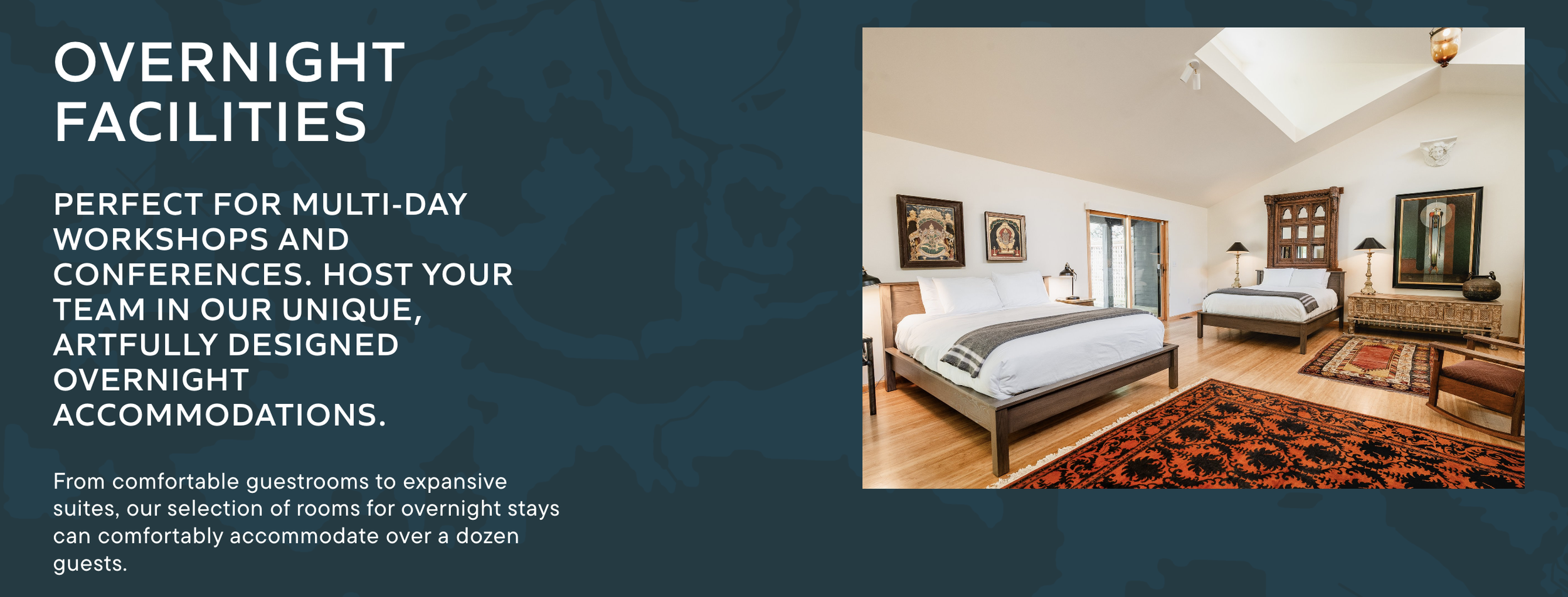 Stay in beautifully appointed private or shared rooms onsite for a deeper experience